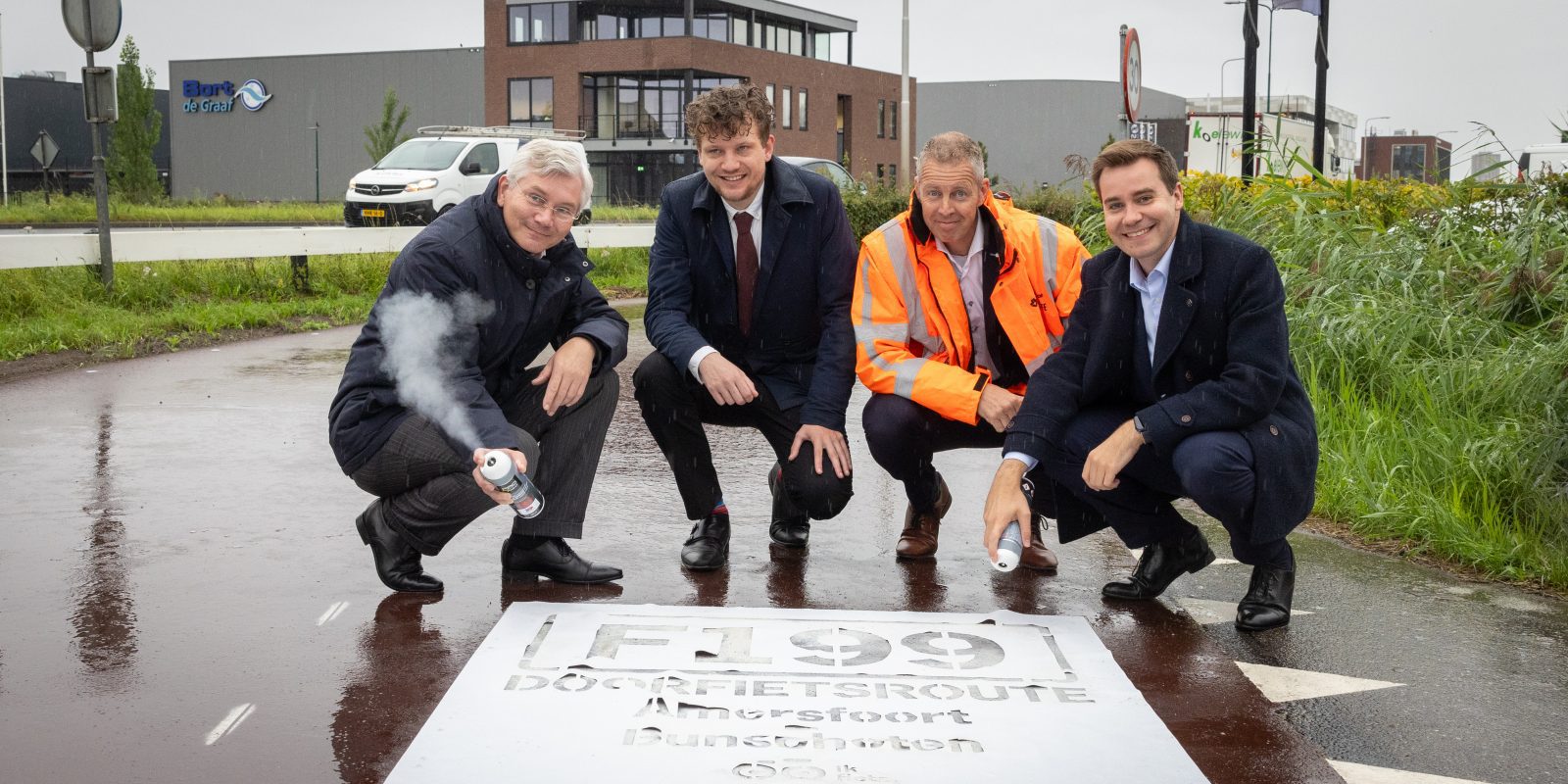 Donderdag 21 september is de aanleg van de doorfietsroute Amersfoort – Bunschoten gevierd. De werkzaamheden aan deze route zijn op 10 augustus begonnen en inmiddels al een eind gevorderd. Gedeputeerde André van Schie, wethouders Tyas Bijlholt (Amersfoort) en Rick Beukers (Bunschoten) en Ronald van der Valk (manager Strukton) brachten gezamenlijk met krijtverf een tag aan op het nieuw geasfalteerd fietspad in Bunschoten en deelden fietslampjes uit aan bezoekers en fietsers op de route. Naar verwachting zijn eind van het jaar de werkzaamheden aan de bestrating van deze doorfietsroute klaar.