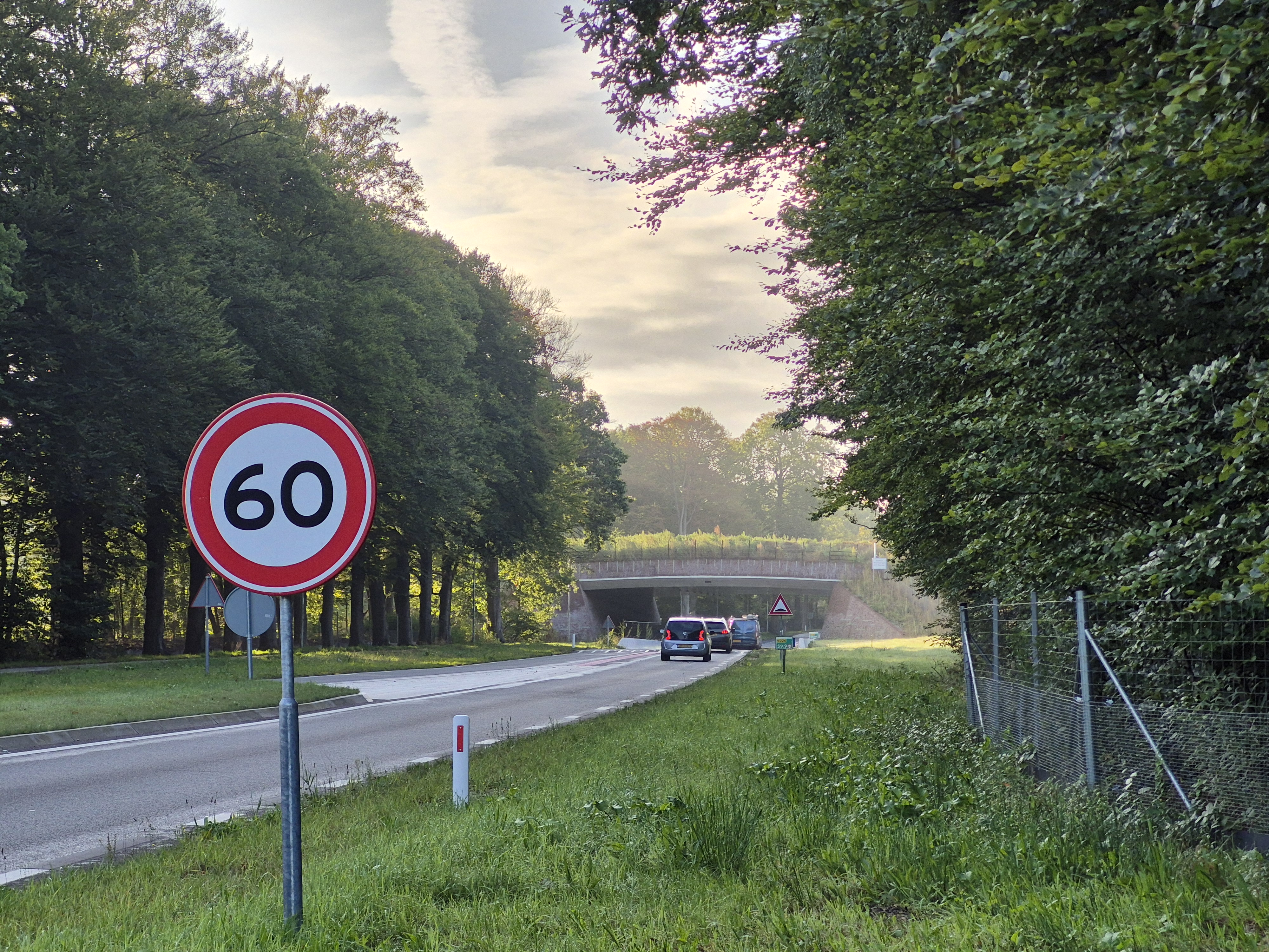 Veiligere weg en schonere luchtMet de aanleg van het ecoduct is de snelheid op de weg verlaagd naar 60 kilometer per uur om het geluid en de uitstoot van schadelijke stoffen te verminderen en de veiligheid van mensen en dieren te vergroten.